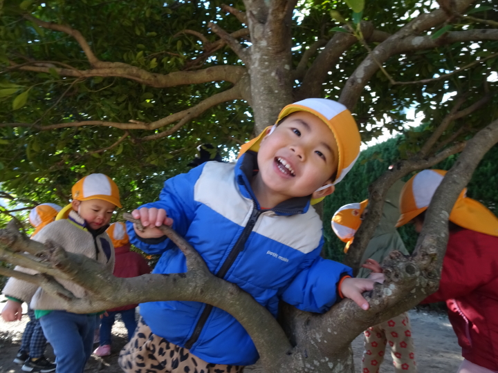 そのうちに丁度いい感じの木を見つけて、ニコッ。一人が撮影してもらうと、だんだんと近づいてて来て、グループ写真になることもあります。子ども同士の関わり合いを大切にしています。