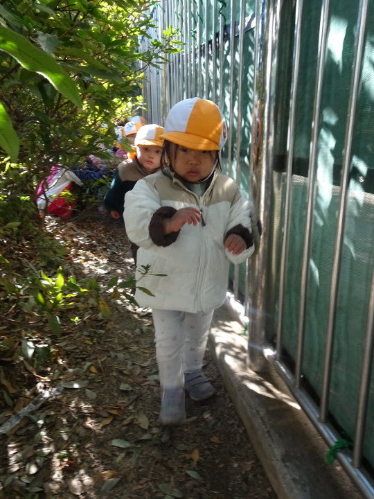 お友だちと遊ぶことに興味津々のちょうちょ組。一人が探検に行くと『何しているの』とばかりに次々について行きます。気付けばみんなで探検隊。狭い所も何のその、とても楽しくて何度の繰り返しぐるぐると回っています。