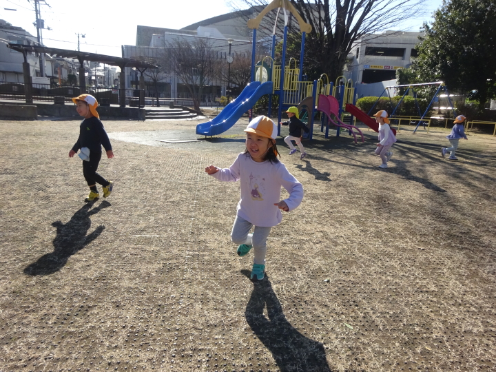 寒さが厳しい日もありますが、準備体操をして体を温めてから遊んでいます。"だるまさんがころんだ"など楽しんでいます。